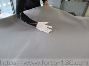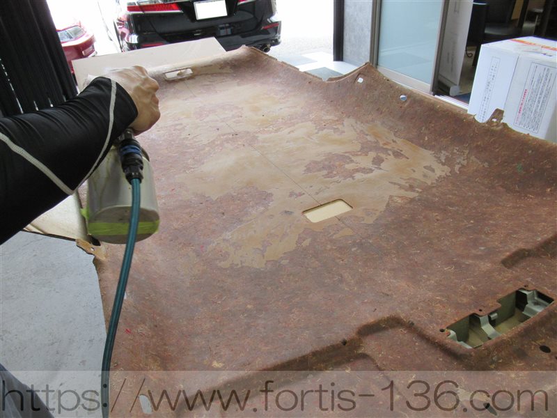 内張り、新しく張り替える生地に接着剤を吹き付けます